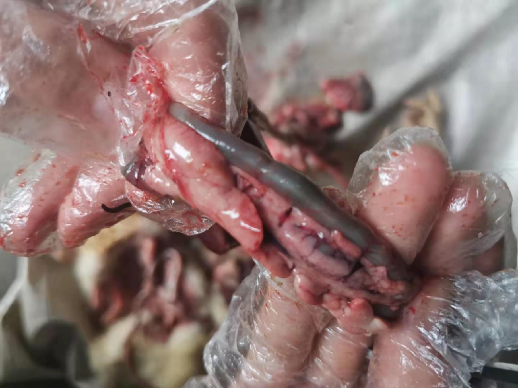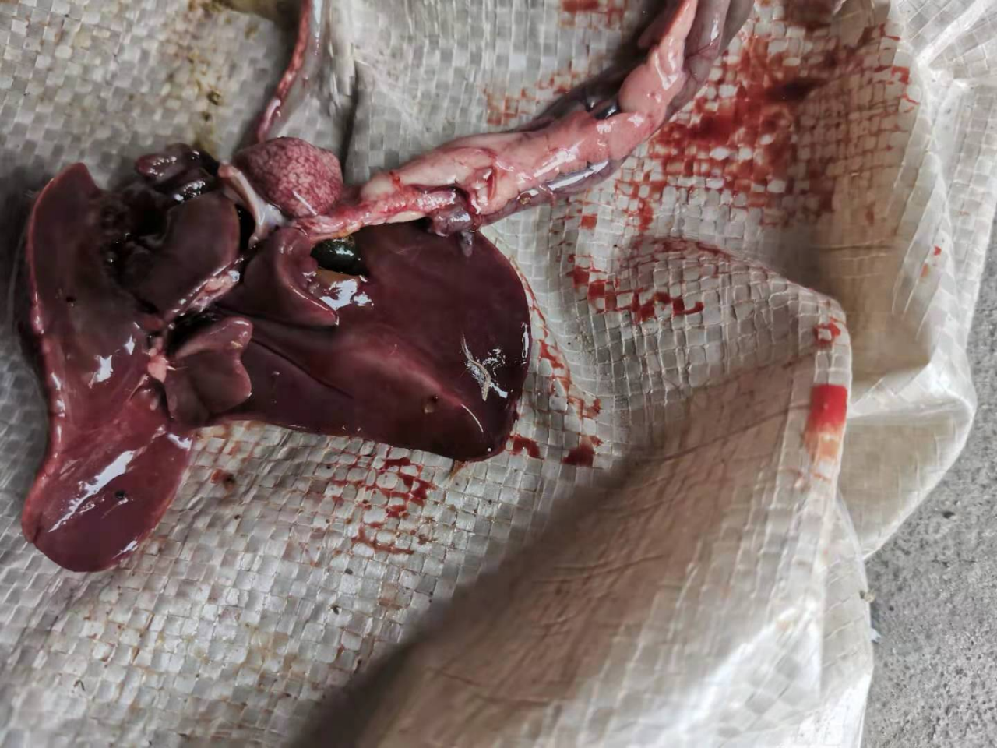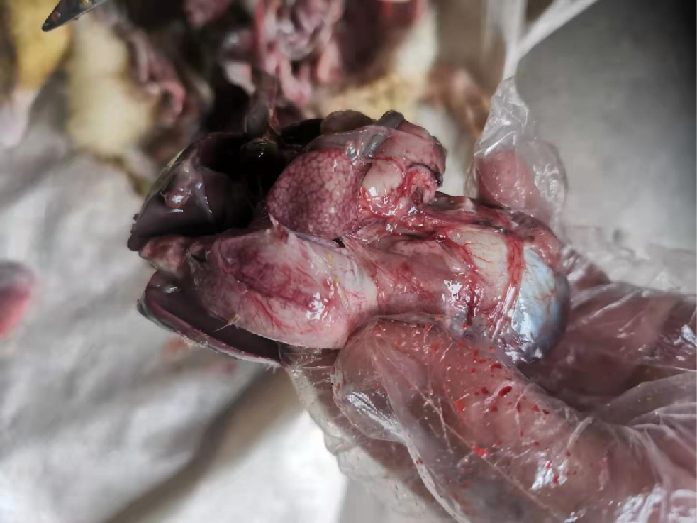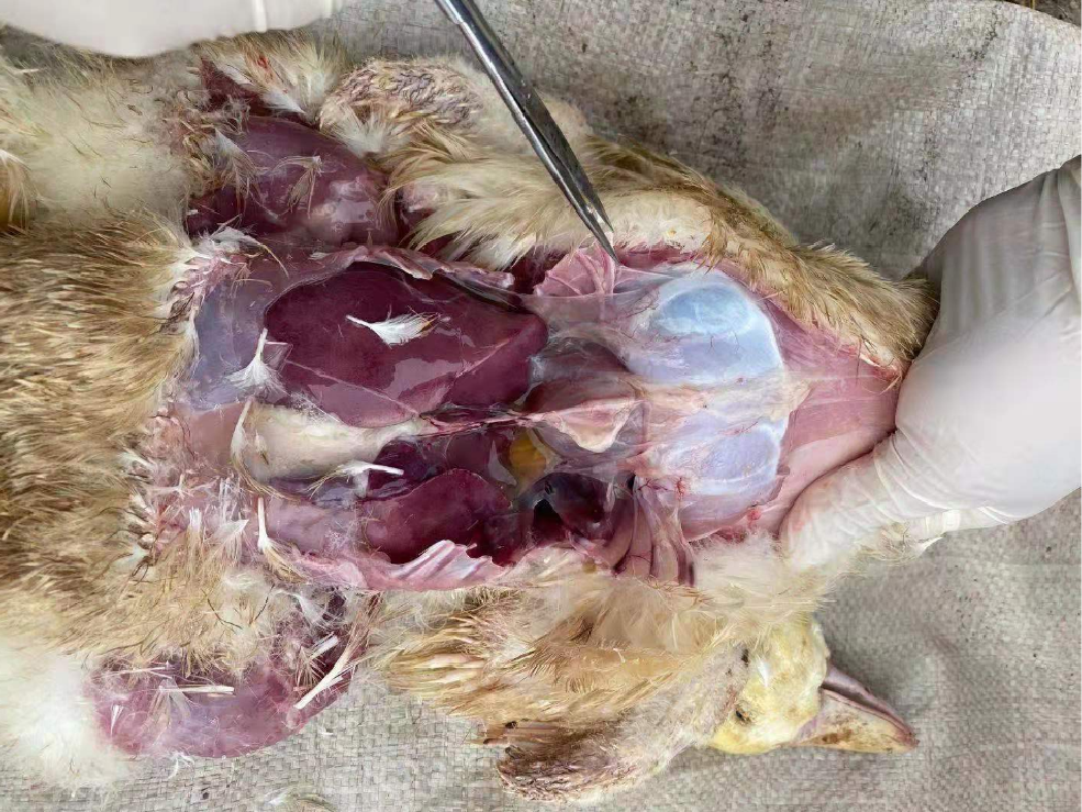 病死鸭气管有出血、肺脏充血、出血颜色变深,严重的有黄色纤维素样物包裹,气囊浑浊增厚、有黄色干酪样物渗出,部分病死鸭心包有黄色积液,肝脏有灰白色纤维素样物渗出,脾脏肿大成大理石样坏死,胰脏肿胀有出血。